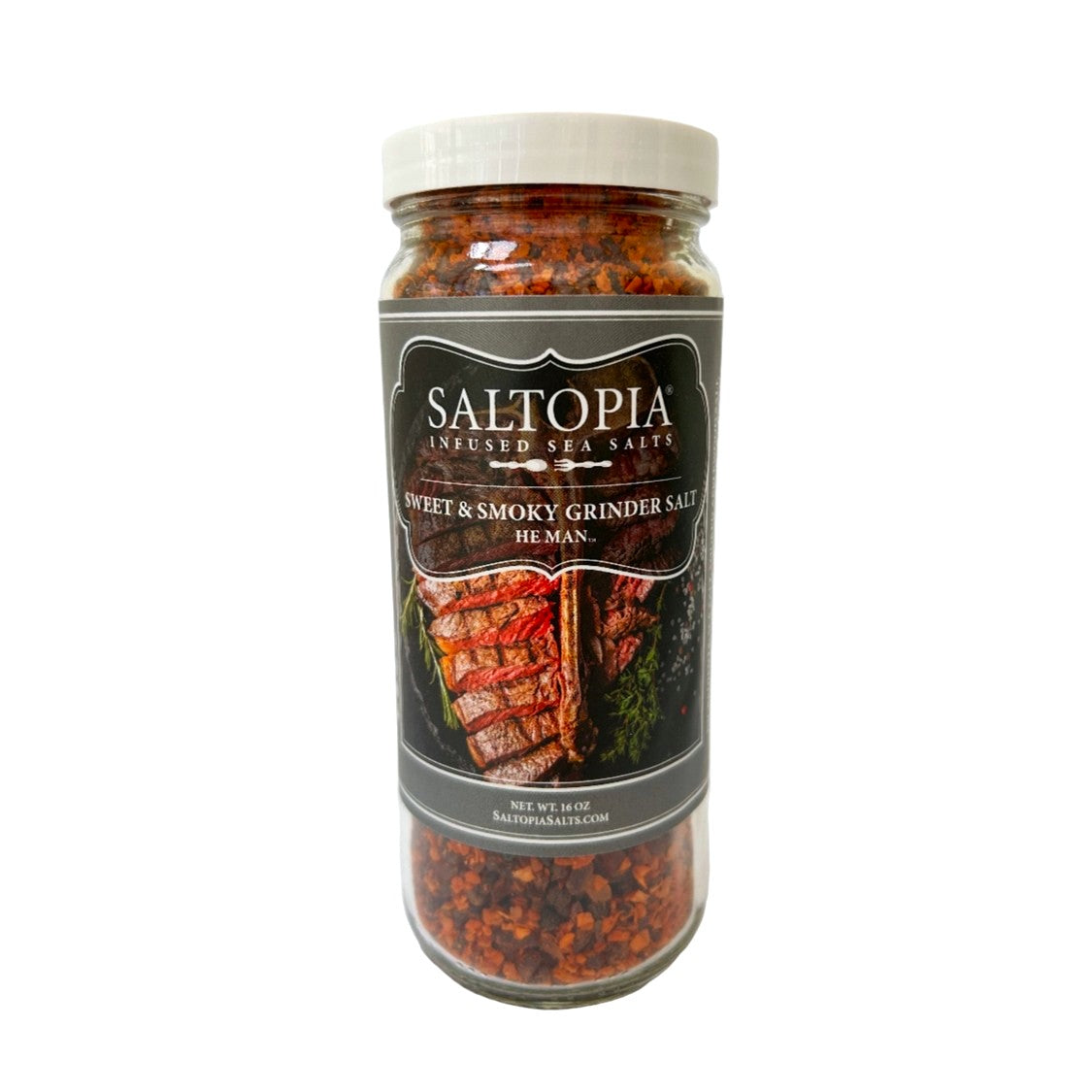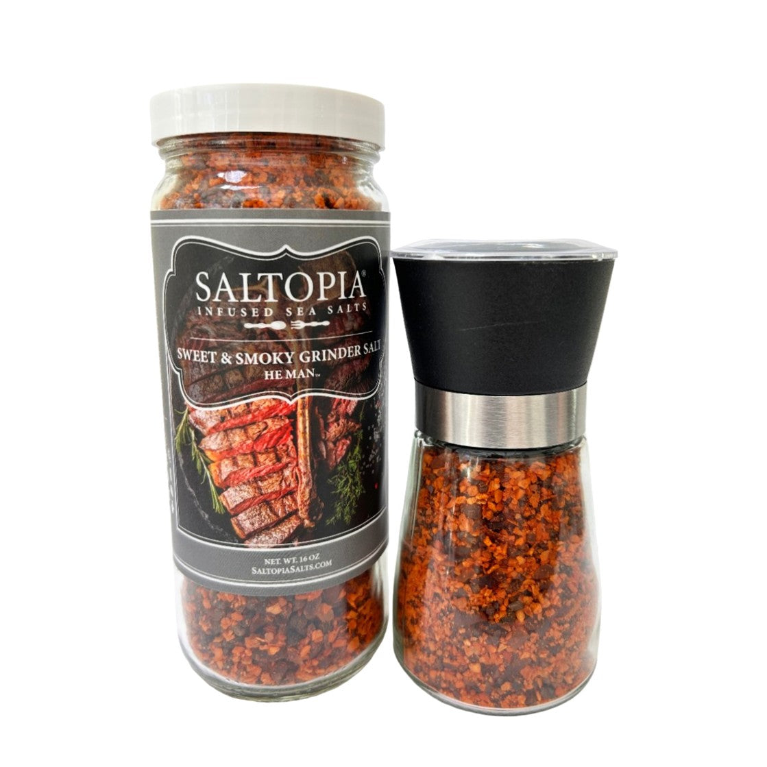 This set includes an 8oz refillable grinder, plus the 16-ounce refill jar. The HE MAN flavor offers fans a coarse grain sea salt infused robust notes of hickory & smoked applewood, smoothed over by roasted garlic, then finishing with a touch of raw crystal cane sugar. He’s a true grit with no mirrors, only smoke and flavor. Try on anything from meats, fish and poultry to veggies or pasta!