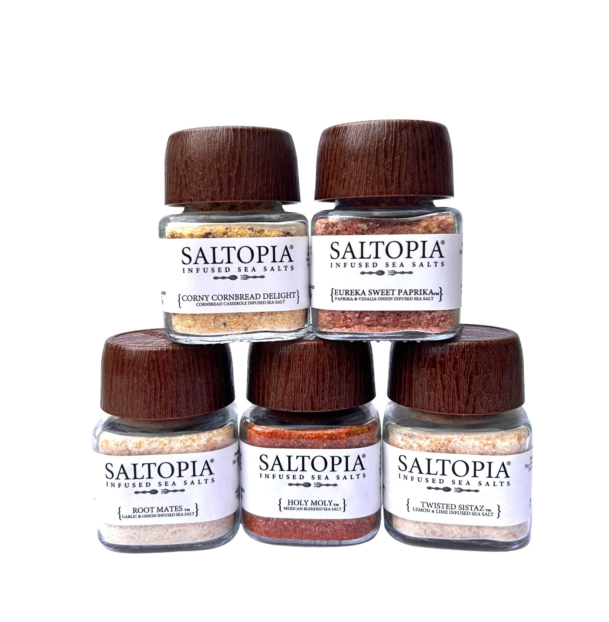 SALTOPIA’s “Taco’Clock” gift set is for the Holy Guacamole, Tacos, Nachos, Burritos, Fajitas & even Margaritas! SALTOPIA has nailed the flavors that make authentic Mexican food so incredibly delicious! This gift set includes five robust flavors including the best-selling Mexican blend, lemon & lime, sweet paprika, garlic & onion and a special zesty corn flavor. Each set includes five 3.4oz glass jars of SALTOPIA Infused Sea Salts for all levels of cooking; plus 5 recipe cards with 3 recipes per flavor included; 5 SALTOPIA signature spoons - all beautifully packaged in "ready to gift" boxes with a corresponding themed wrap/sleeve making the set extra special! Our products are 100% pure and made in the USA. Shelf life is 3 years from the date of the receipt. Store cool & dry.