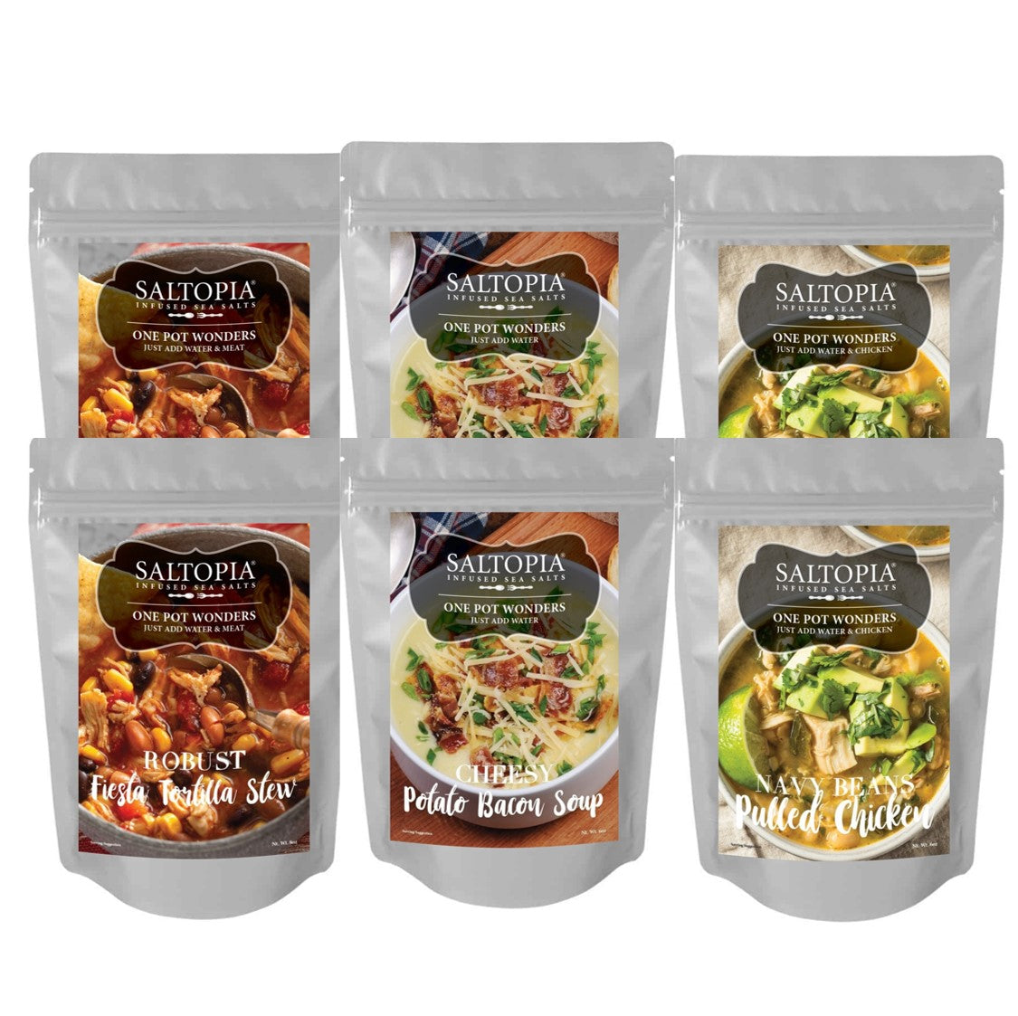 SALTOPIA’s ONE POT WONDERS hit the spot for cold evenings and cravings for crocks of slow cooked meals. We skip the long hours of stewing and fast forward to flavorful, easy to make recipes! Each pouch contains ample ingredients, featuring a minimum of 3-4 servings per pouch. Simply add water, choice of protein or enjoy the recipe as is, simmer and serve! Plus, each pouch offers options for recipe changes for added gourmet creativity. Set includes 6 pouches, 2 of each of our One Pot Wonder combinations. Plus, we are including 3 SALTOPIA Infused Sea Salts to use with the recommended recipes shared! Our products are 100% pure and made in the USA. Shelf life is 3 years from the date of the receipt. Store cool & dry.