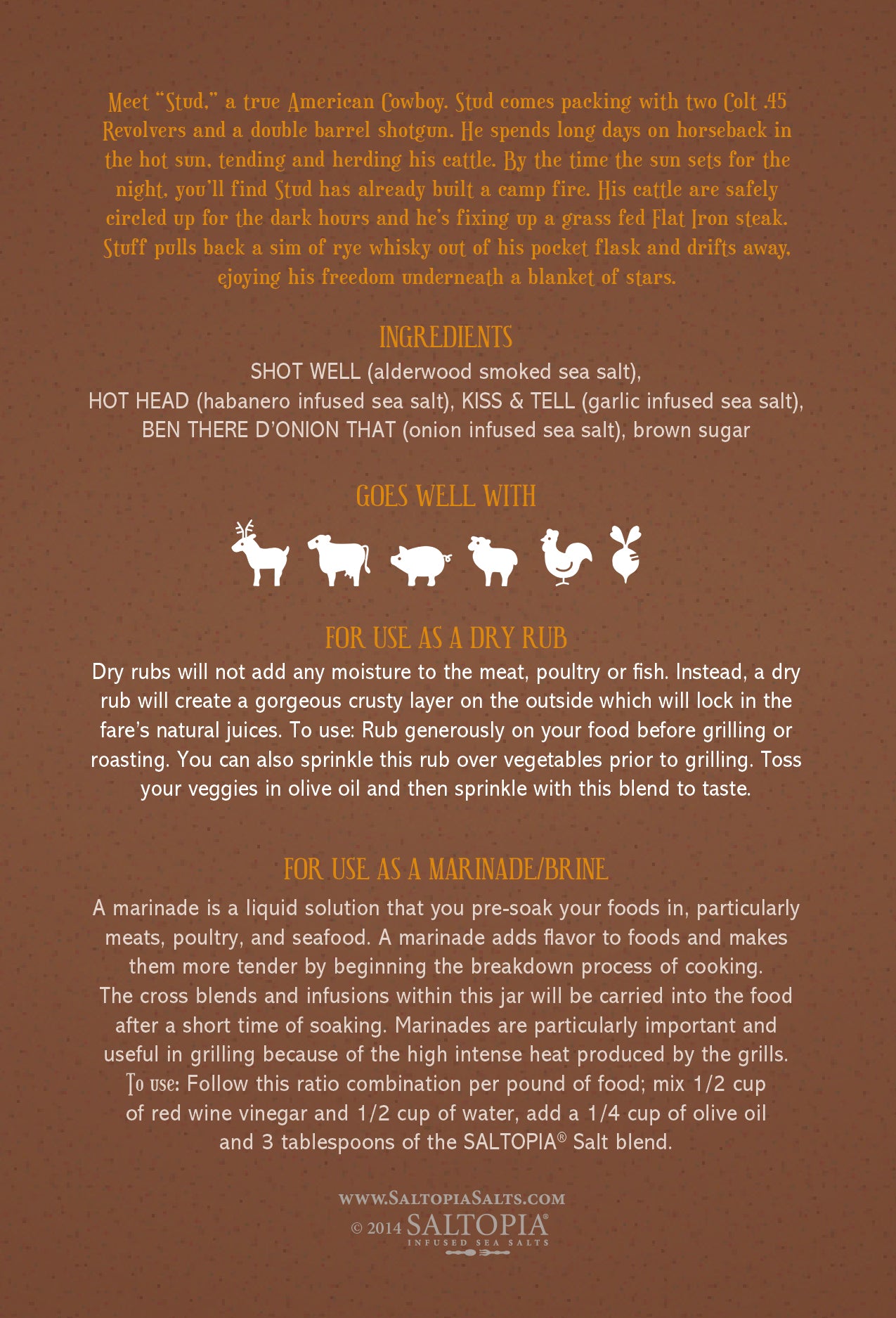 When cowboys enjoy a meal out on the range, the flavor combinations offer true smoke, rooted vegetables and of course a tick of heat! We've finished that robust combination with dark brown sugar to sweeten the style! This flavor is simply the cowboys "go to" for all to enjoy on beef, poultry, pork and more. Read about our cowboy flavor on STUD's card.