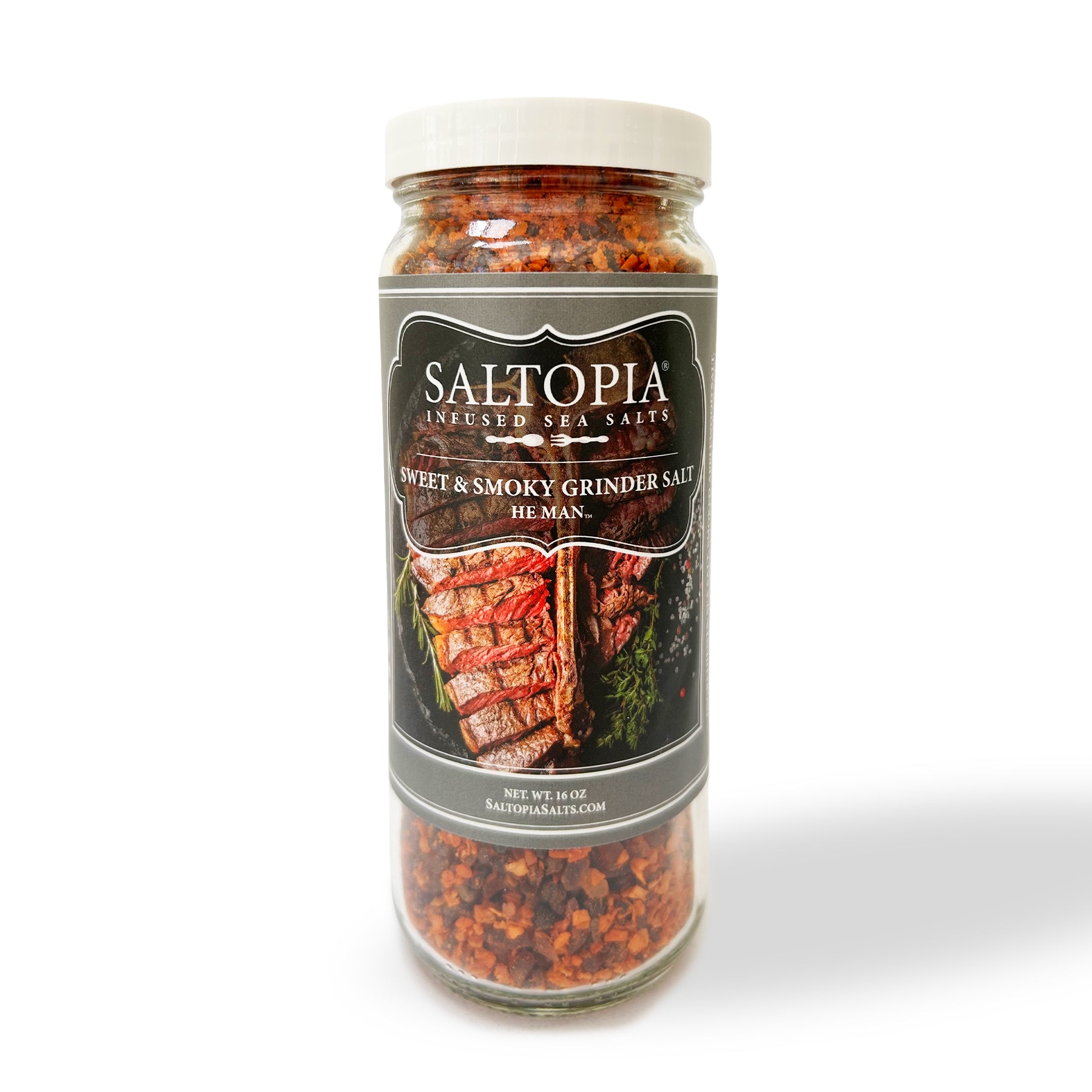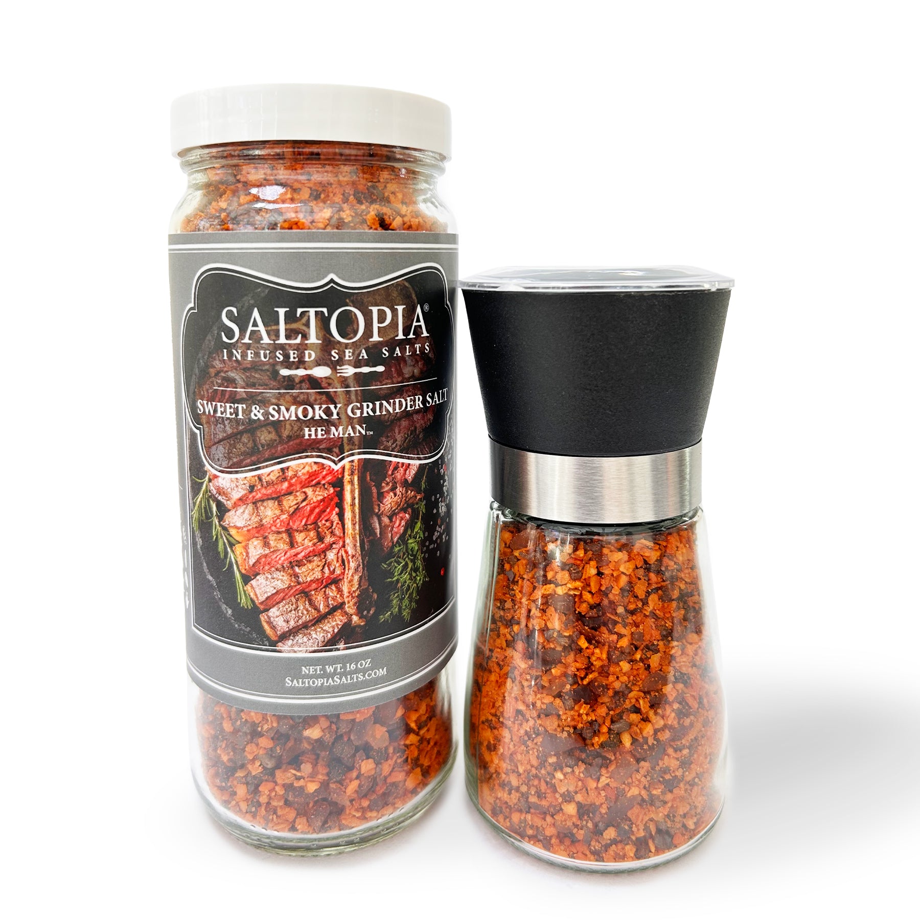 This set includes an 8oz refillable grinder, plus the 16-ounce refill jar. The HE MAN flavor offers fans a coarse grain sea salt infused robust notes of hickory & smoked applewood, smoothed over by roasted garlic, then finishing with a touch of raw crystal cane sugar. He’s a true grit with no mirrors, only smoke and flavor. Try on anything from meats, fish and poultry to veggies or pasta!