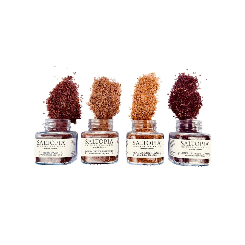 Cooking with wine adds a unique depth of flavor that other liquids can't replicate. The acidity in wine helps balance rich, fatty, or savory flavors, while also brightening up the overall taste. SALTOPIA’s taken this a step further and created wine infused dry rubs perfectly paired with herbs & spices which will become the kitchen’s best kept secret! The set includes 4 flavors combining Sauvignon Blanc, Cabernet Sauvignon, Pinot Noir and Gewürztraminer wines with beautiful blends of herbs. We finished the set by featuring all 4 jars in a ready to gift wine box making this set extra special! Our products are 100% pure and made in the USA. Shelf life is 3 years from the date of the receipt. Store cool & dry.